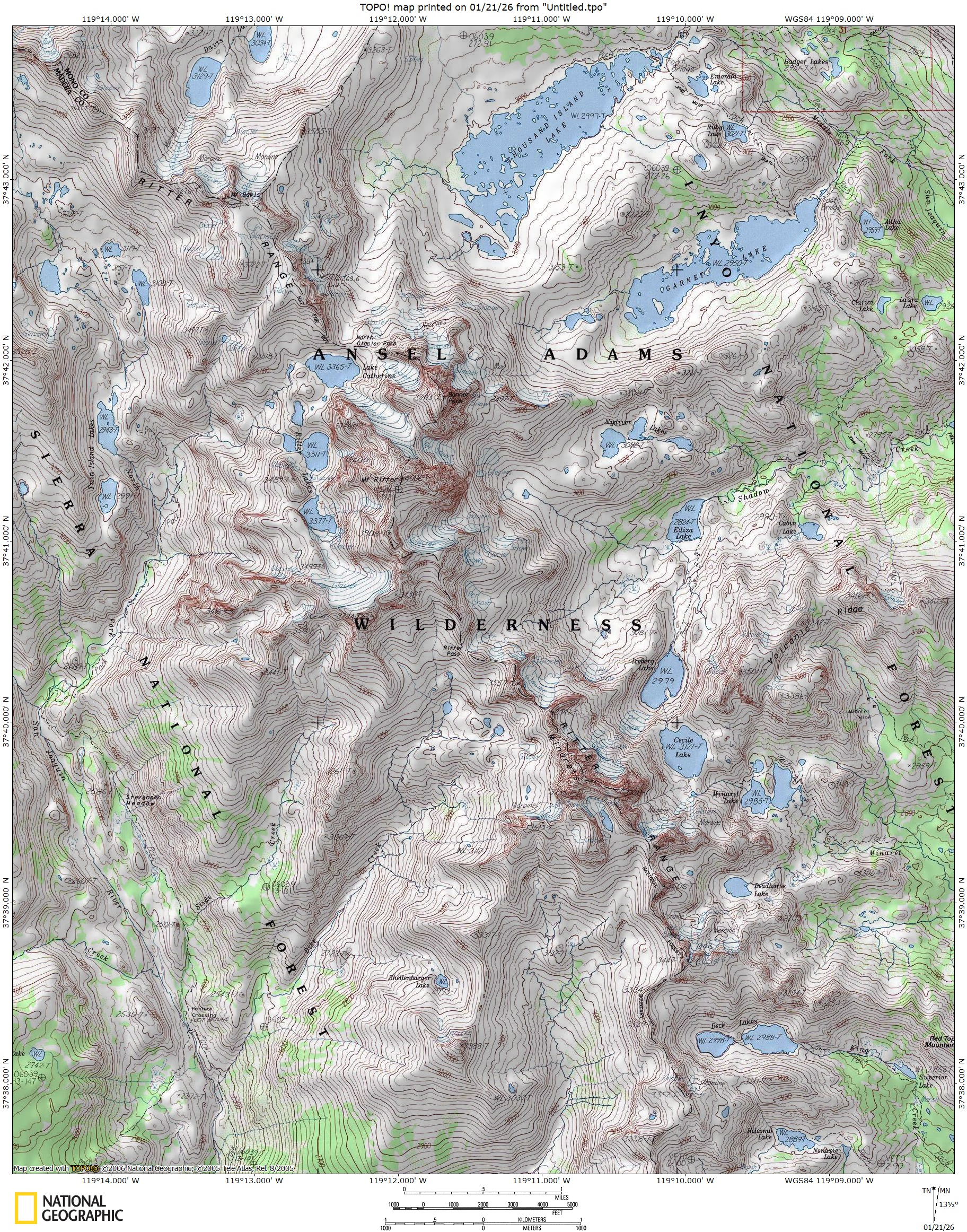 2.) Mount Ritter (class 3 13,157') and the easier Minarets Adams (class 3 12,000'), Starr (class 2 11,512') and Pridham (class 2 10,960') from Angew Meadows